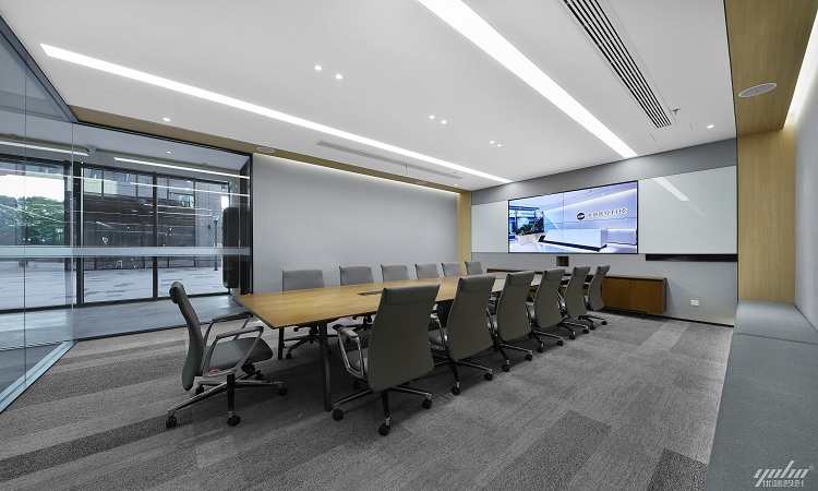 不同的材質凸顯空間的多樣化和藝術性,特別是頂麵、地麵的效果呈現:水磨石灰與原木的斜切拚組在視覺上形成衝突對比,體現定製化的高級設計。總經理室承載著使用者的日常辦公與社交的功能需求。大氣沉穩環境氛圍彰顯著領導人的遠見卓識與不凡品味。延續整體空間簡潔、現代的調性,大會議室簡約而不失格調,用於接待客戶與召開正式會議。